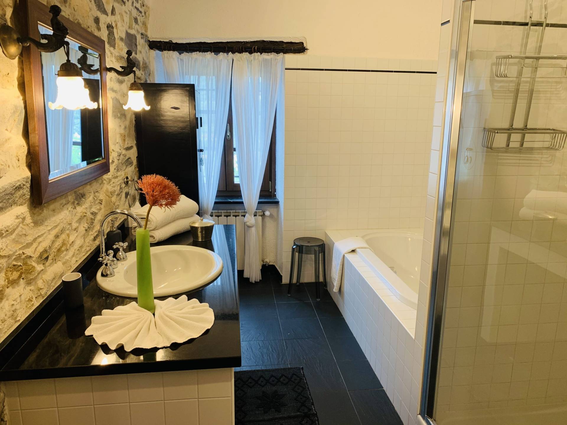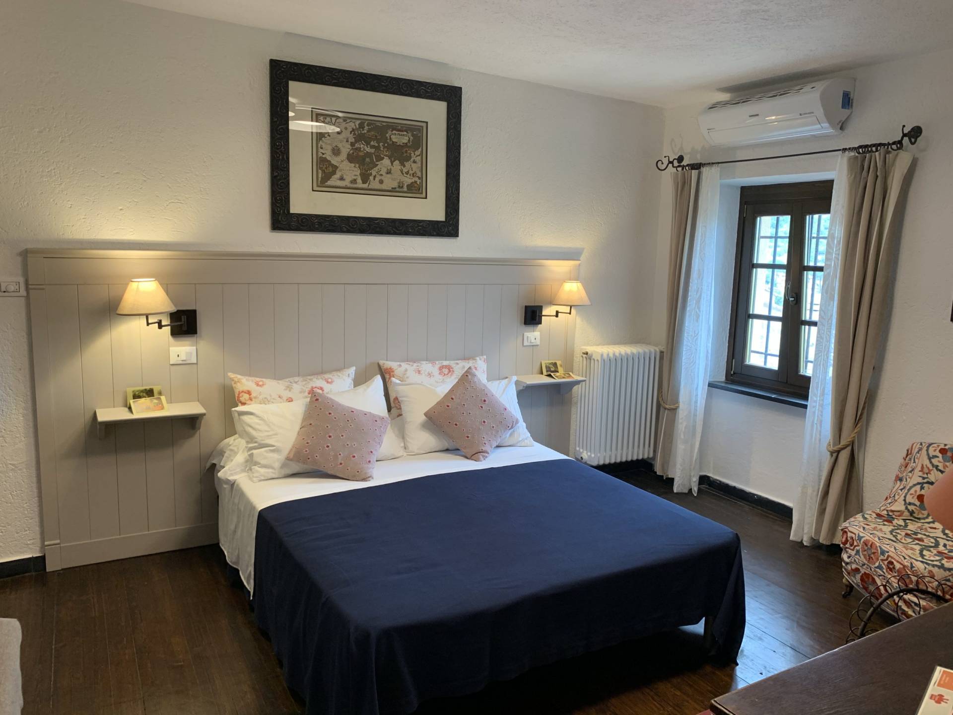 DettagliDieses Zimmer bietet eine helle und einladende Atmosphäre. Der Blick auf den Garten und den grünen bewaldeten Hügel bietet ein bezauberndes und entspannendes Naturbild.